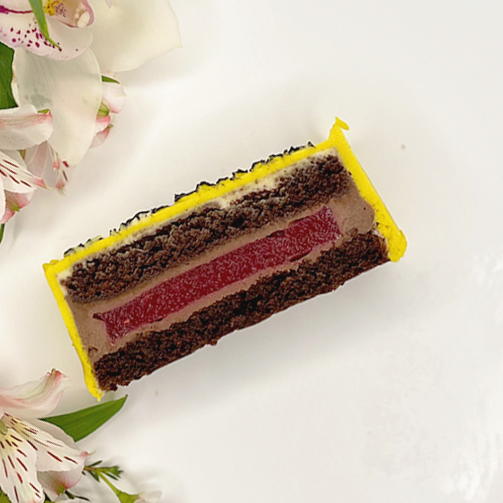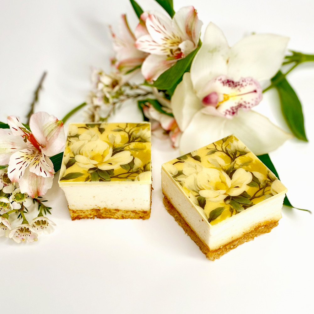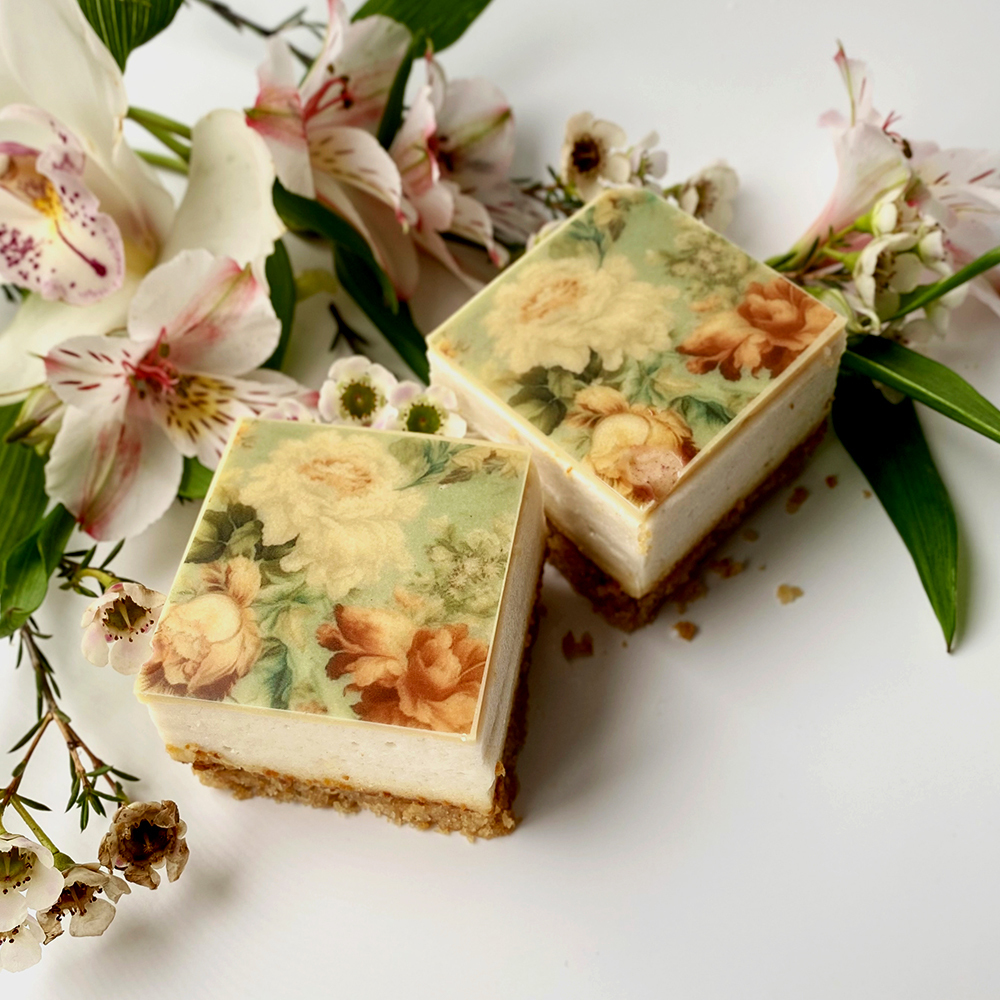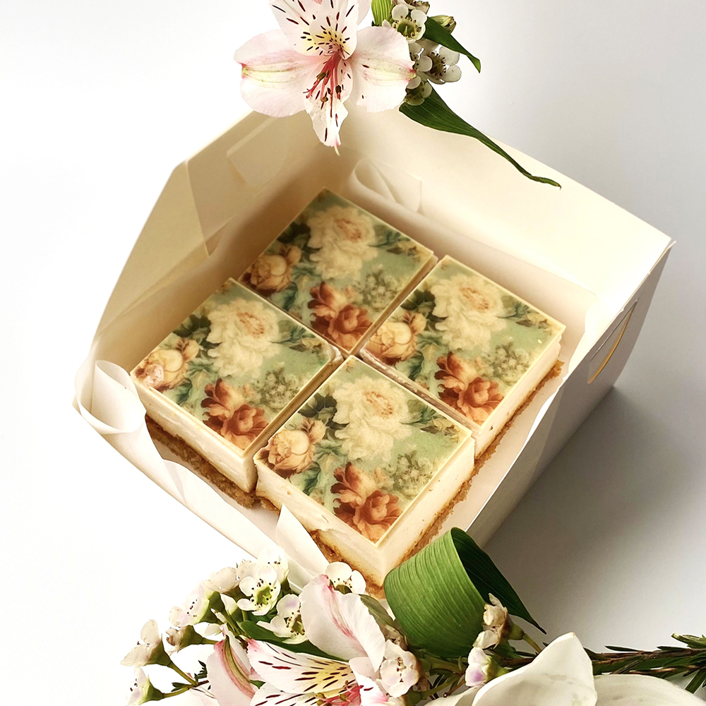 ◉ Пирожные "Птичье Молоко" или "Тирамису" с цветочным принтом на белом веганском шоколаде.